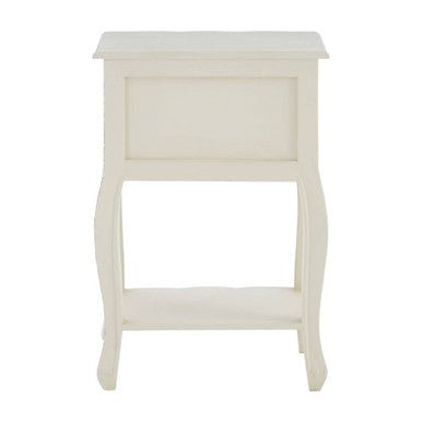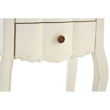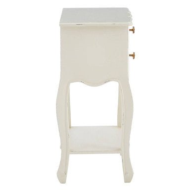 Orsina crafts this white bedside table from bayur wood in a distressed white finish, adding brass rose-shaped knobs and gently curved legs. Two drawers keep essentials discreetly close, ideal for calm, uncluttered bedrooms.