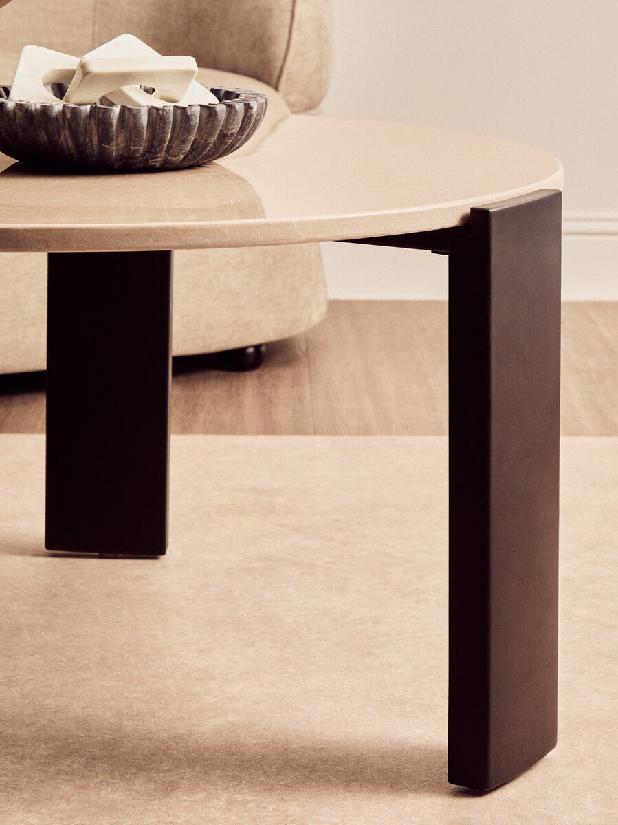 A beautifully honed cream marble tabletop brings warmth and light to your room, showcasing naturally occurring veining and colour variation. The darker structural details (in a sleek black finish) frame the stone and create a contemporary two-tone look that coordinates effortlessly with neutral palettes, black hardware, or mixed metals.