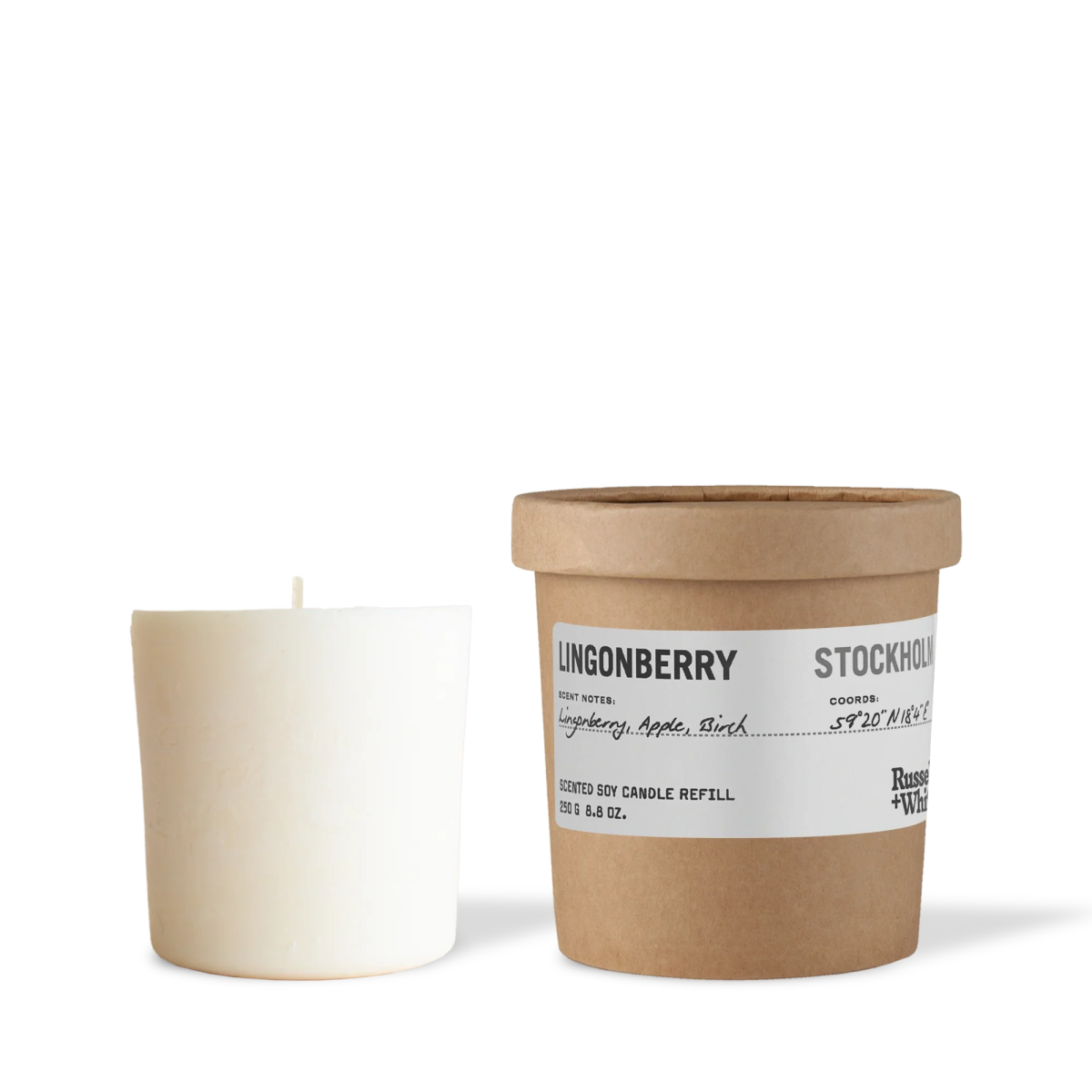 Leave a lighter footprint. Designed for use in our signature R+W refillable glass candle jar. Made using 100% soy wax with a single cotton/linen mix wick.