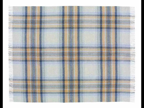 The Kintyre blankets are made by Bronte by Moon at their rare vertical woollen mill in Yorkshire. This classic check is inspired by the rugged Scottish countryside and woven in Yorkshire. The fresh blue colours blend with the warm neutral tones in this blanket and create a warm feeling in your home. They are crafted using naturally sustainable Shetland-type pure new wool. It can be used in your home or outdoors!