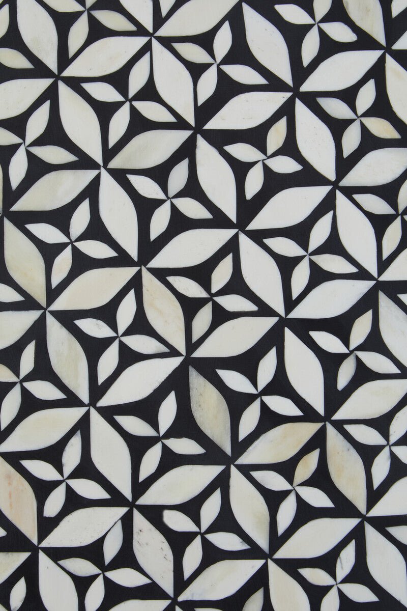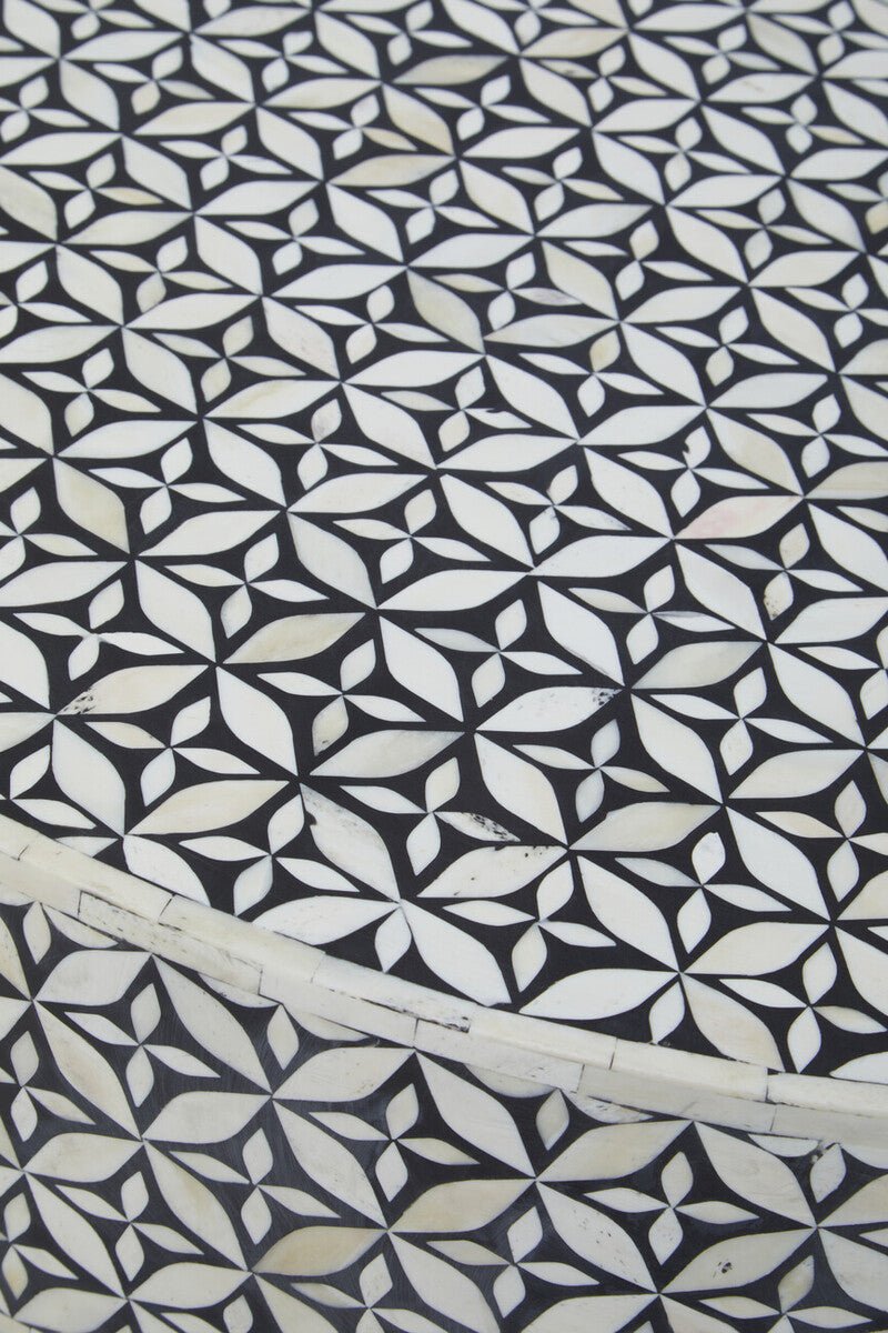 Designed to command attention without crowding your layout, this circular centrepiece pairs a black top detailed with white bone inlay and shell accents with a gleaming column pedestal in a warm gold tone. The result is a refined mix of contrast and texture that suits modern, classic, and eclectic spaces alike.