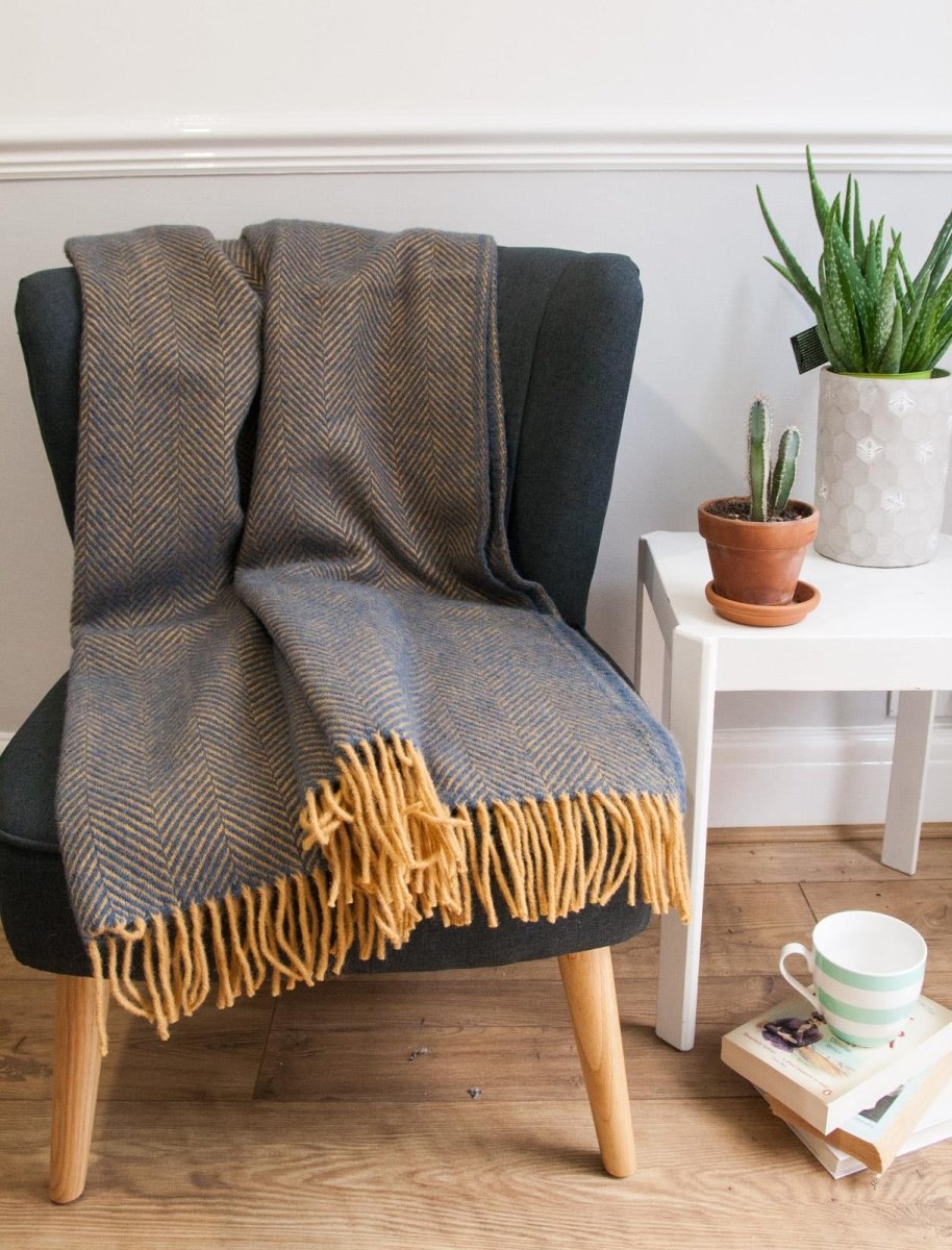 Herringbone Pure New Wool Throw - Navy/Mustard